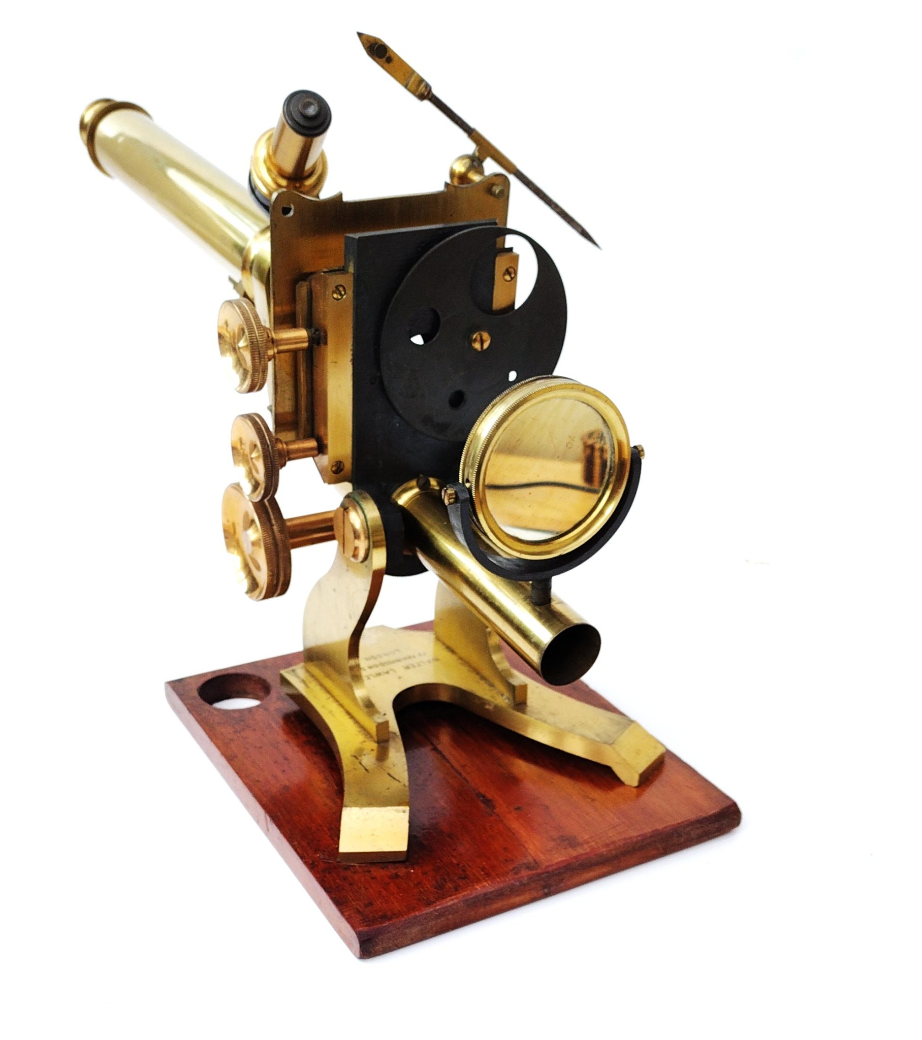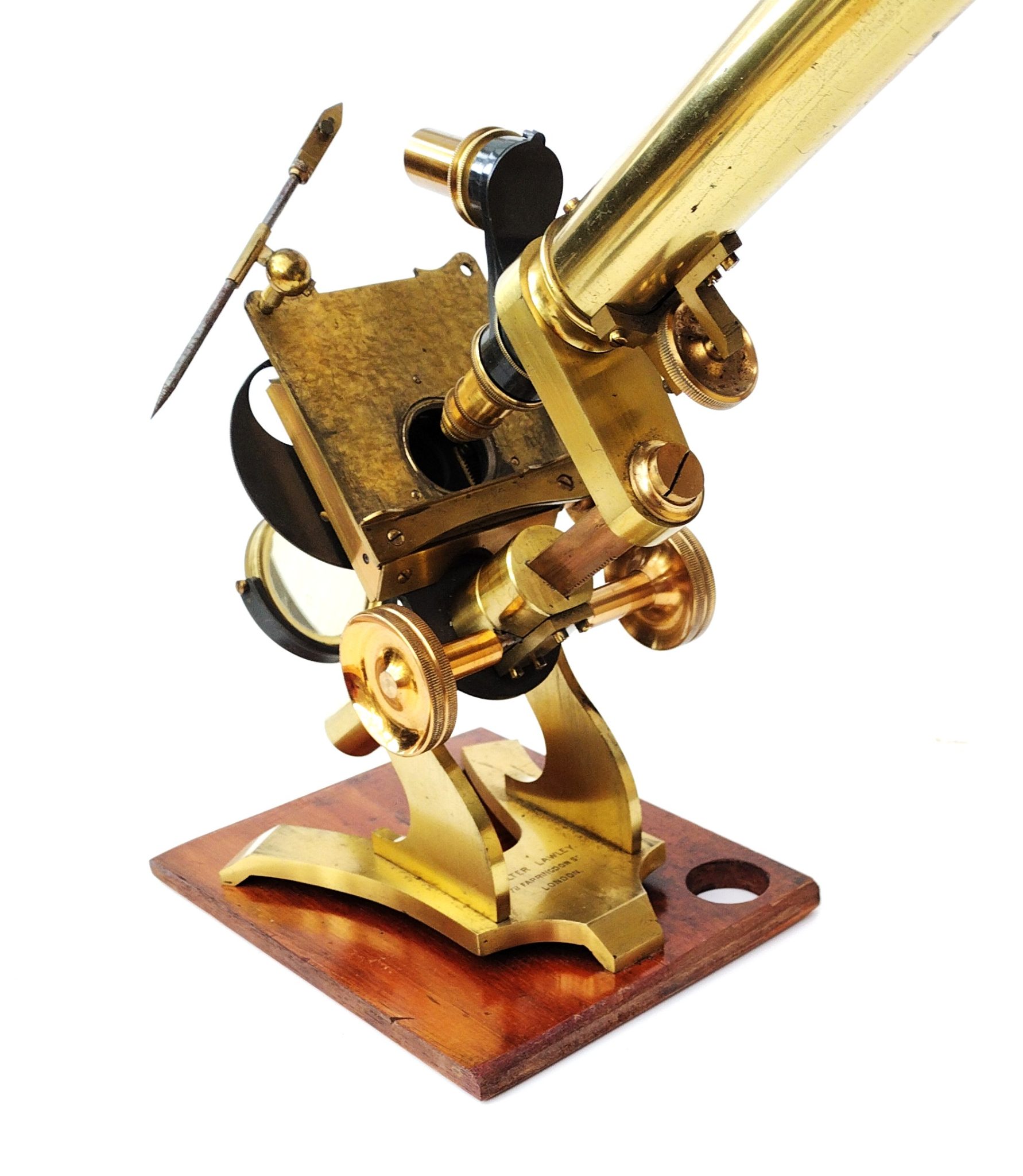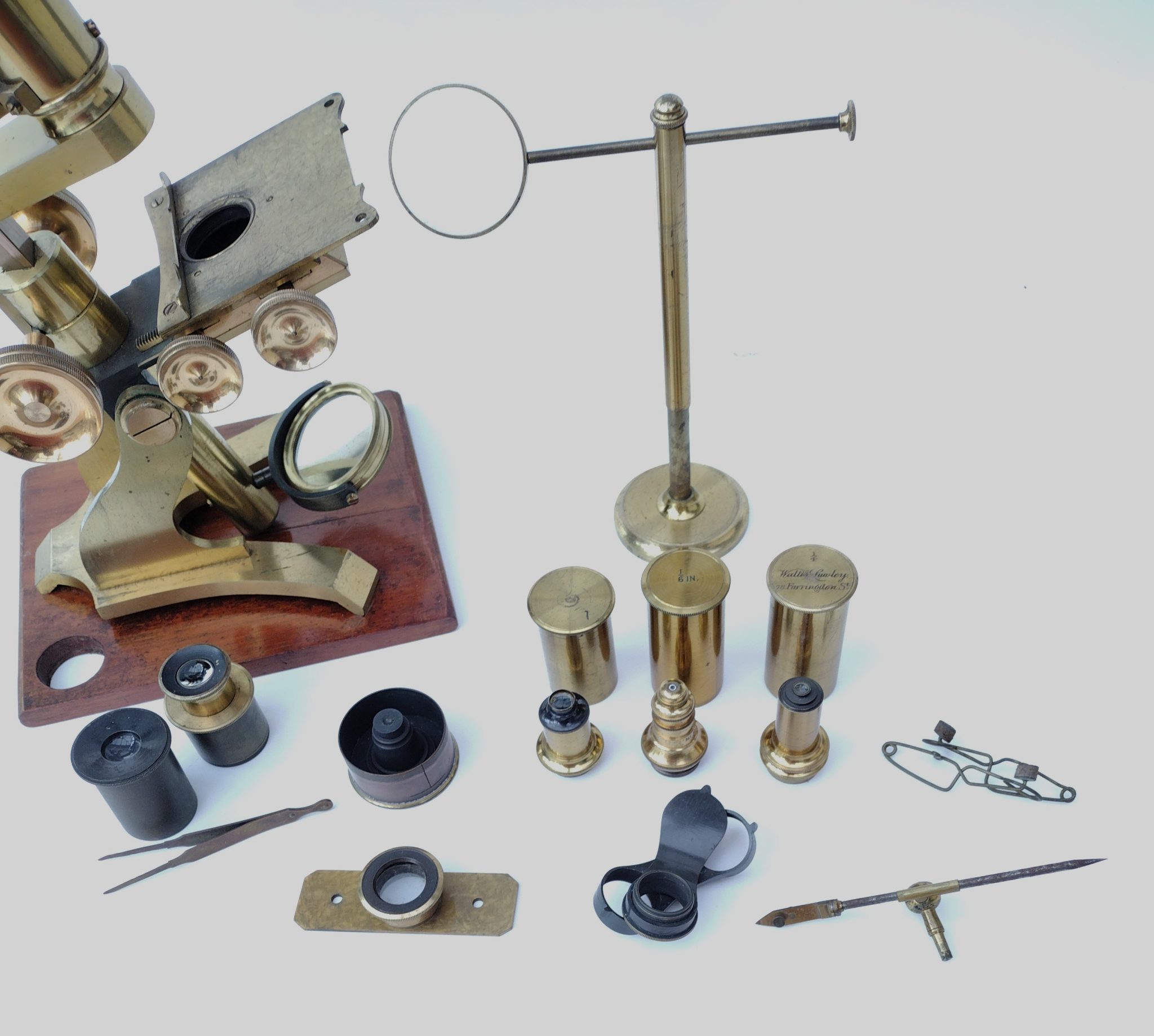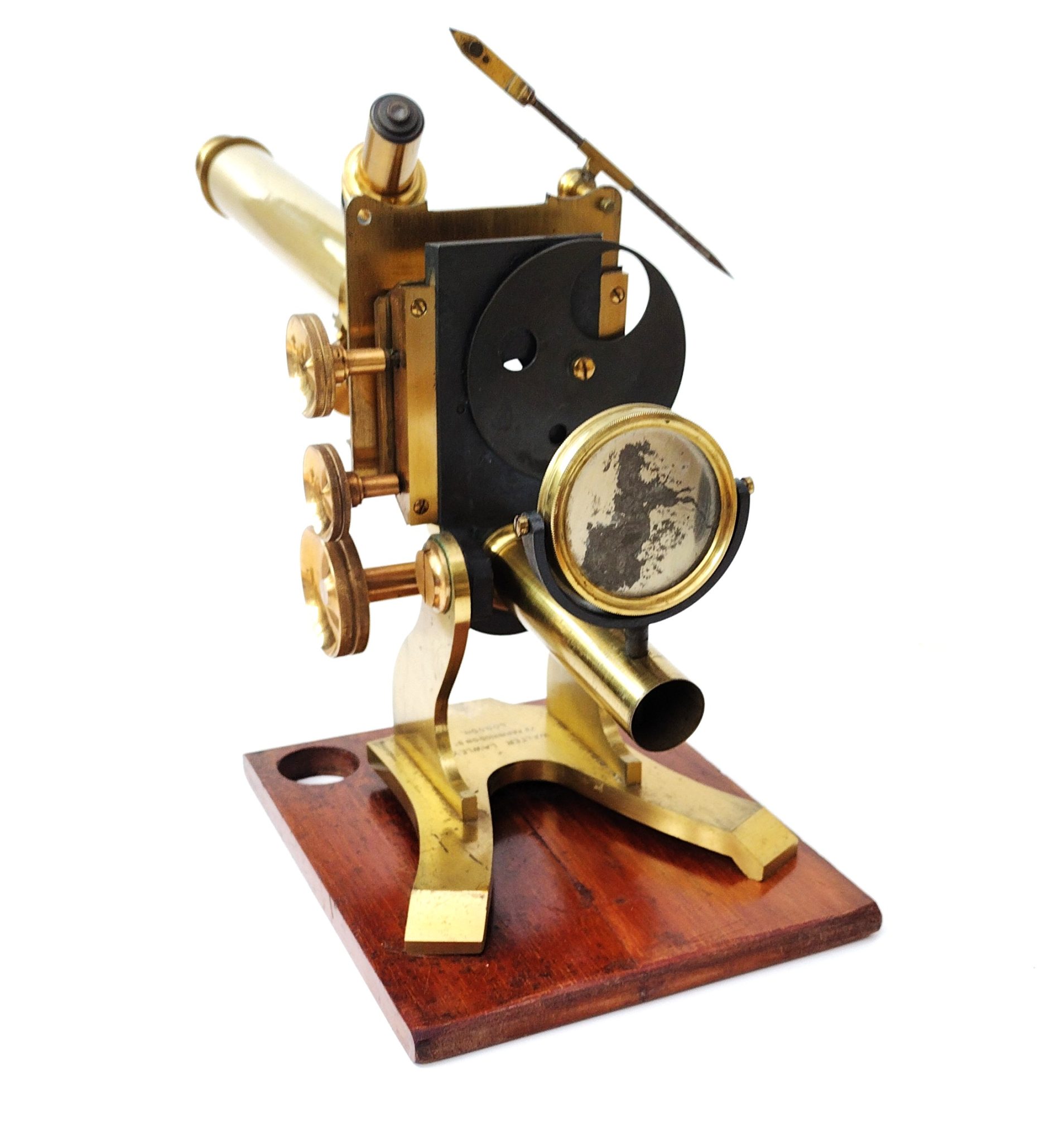 A Society of the Arts style lacquered brass microscope engraved to the foot, ‘Walter Lawley. 78 Farringdon St, London’. It stands 13.5 inches tall on the wooden plinth. The stage has X – Y thumb wheel controls; fine focus is fixed to the draw tube. All rack wheels run smoothly without issues. There is a sub stage wheel of stops and a double sided mirror (one side depleted).