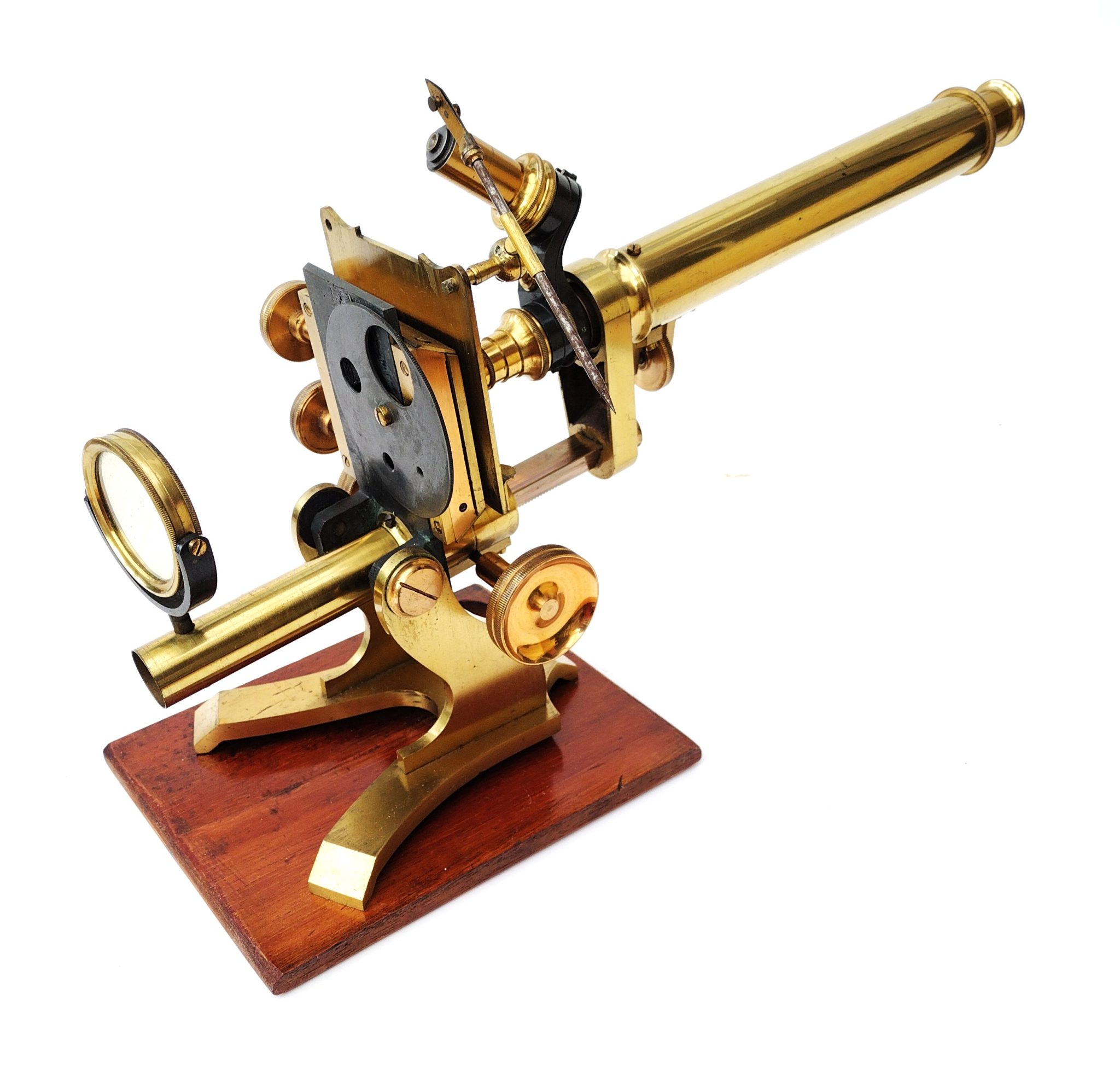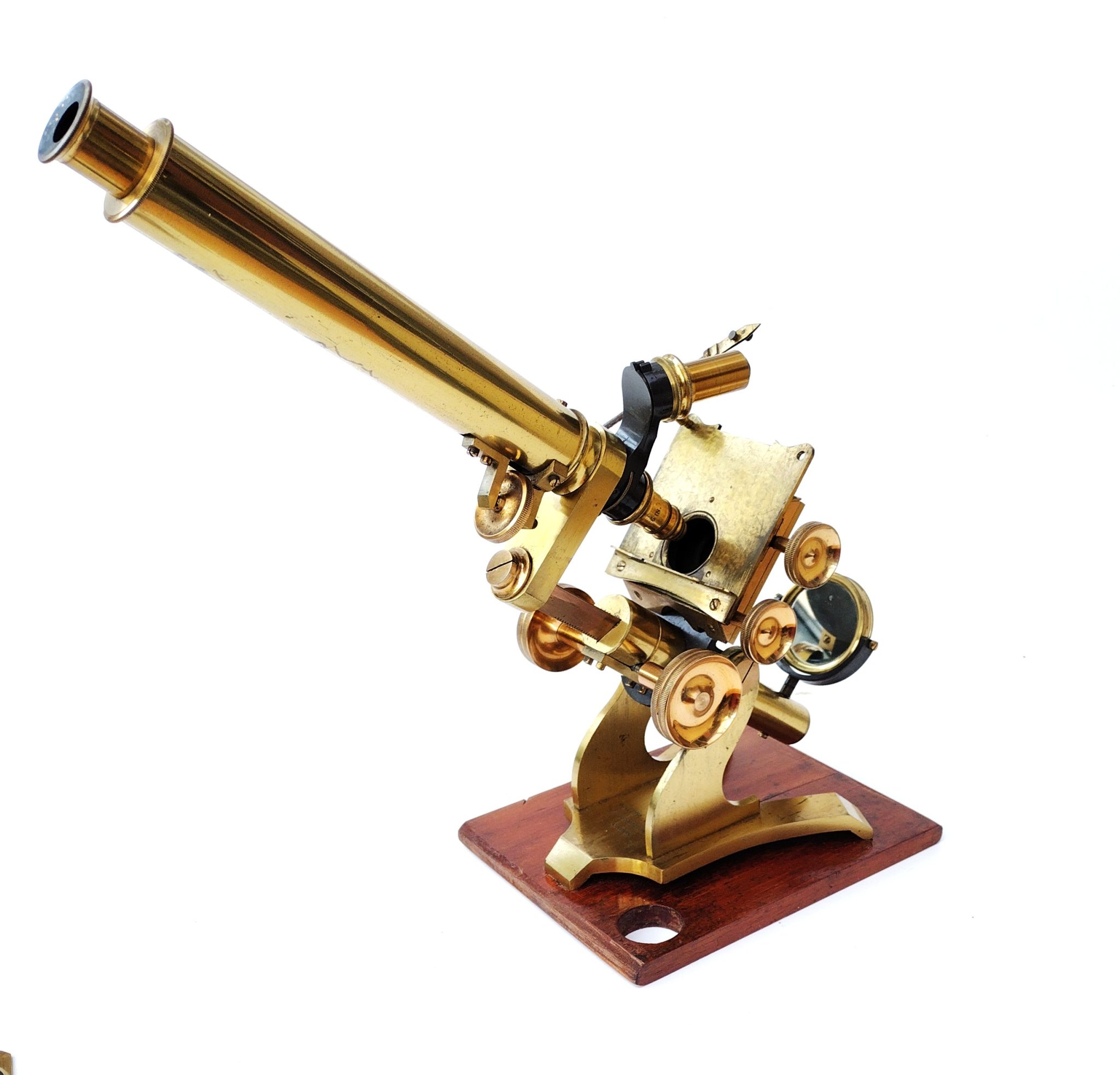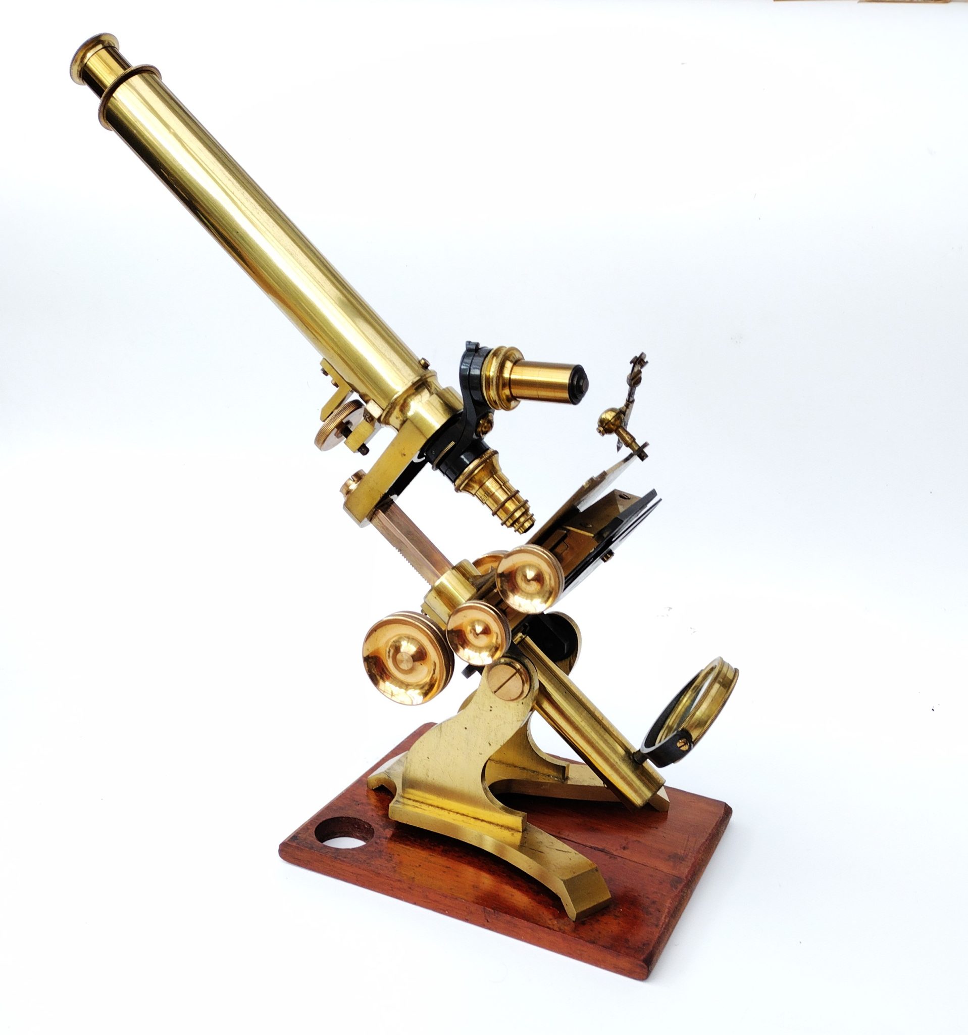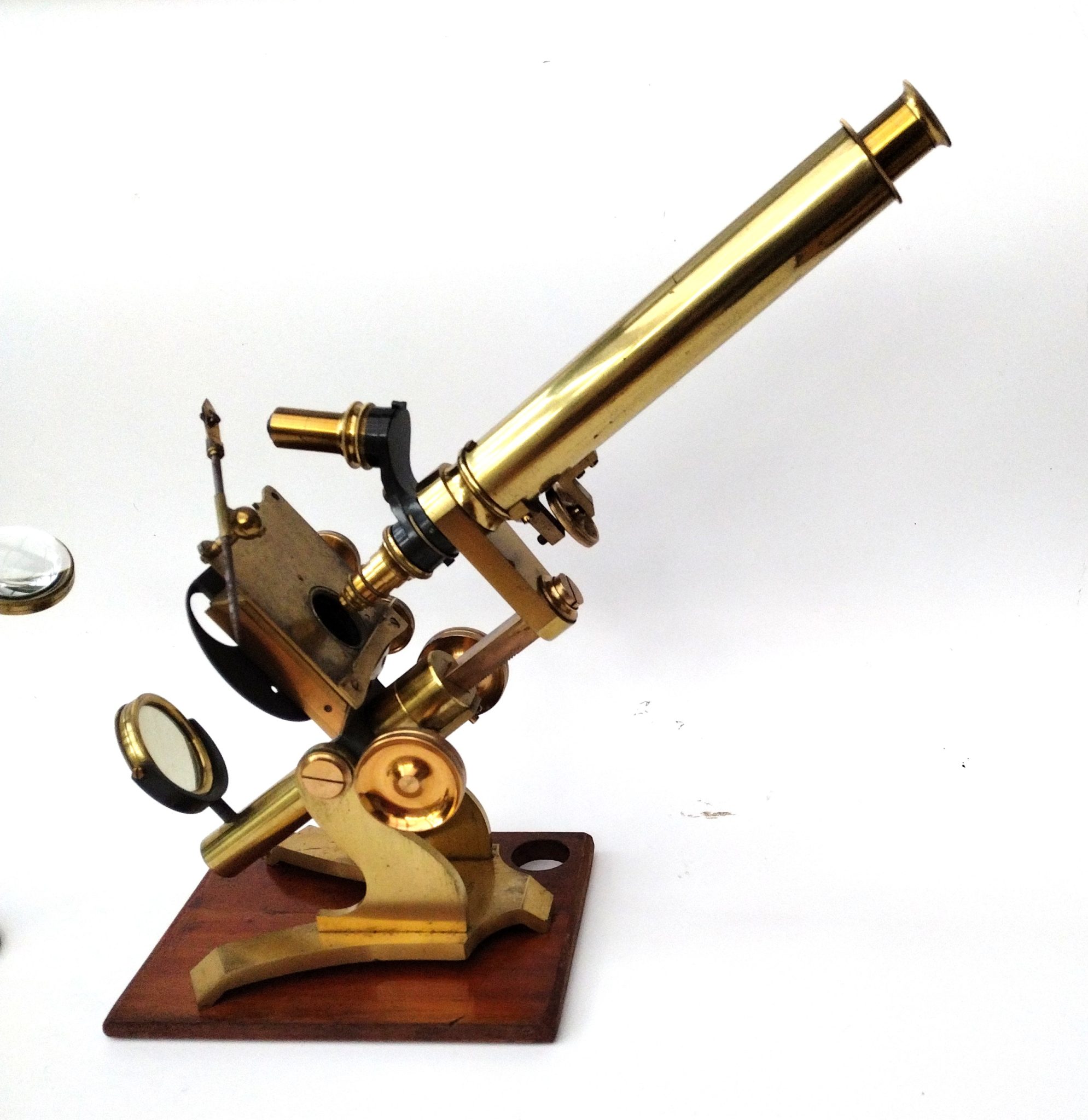 A Society of the Arts style lacquered brass microscope engraved to the foot, ‘Walter Lawley. 78 Farringdon St, London’. It stands 13.5 inches tall on the wooden plinth. The stage has X – Y thumb wheel controls; fine focus is fixed to the draw tube. All rack wheels run smoothly without issues. There is a sub stage wheel of stops and a double sided mirror (one side depleted).
